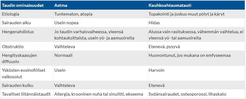 Keuhkoahtaumataudin ja astman erottaminen toisistaan on tärkeää. Vaikka niitä hoidetaan osittain samoilla lääkkeillä, ne ovat kuitenkin etiologialtaan, perusmekanismeiltaan, taudinkulultaan ja ennusteeltaan erilaisia sairauksia.